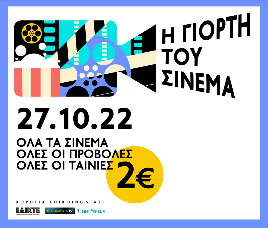 Η Γιορτή του Σινεμά27 Οκτωβρίου 2022Σε όλα τα σινεμά, σε όλες τις προβολές, σε όλες της ταινίες, σε όλη την Ελλάδα.Τιμή εισιτηρίου/άτομο: 2€